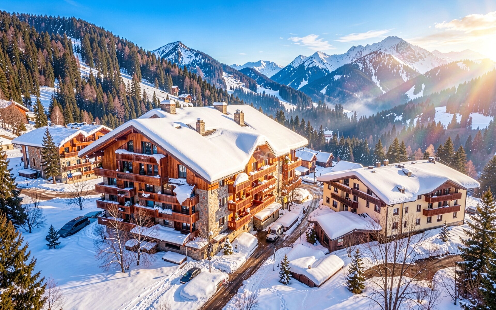 Зимний альпийский шале в заснеженных горах