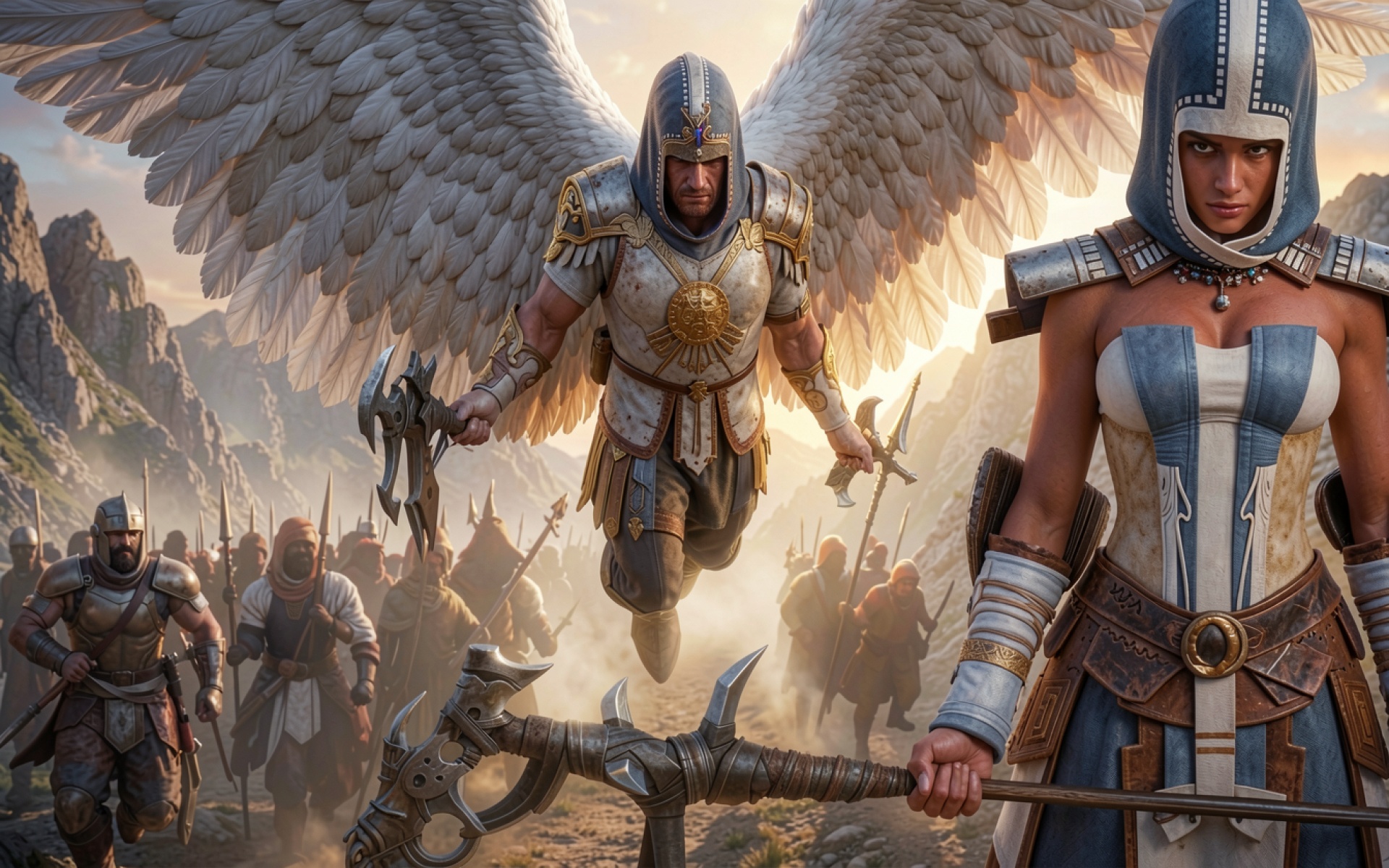 Ангел и воительница в доспехах среди гор