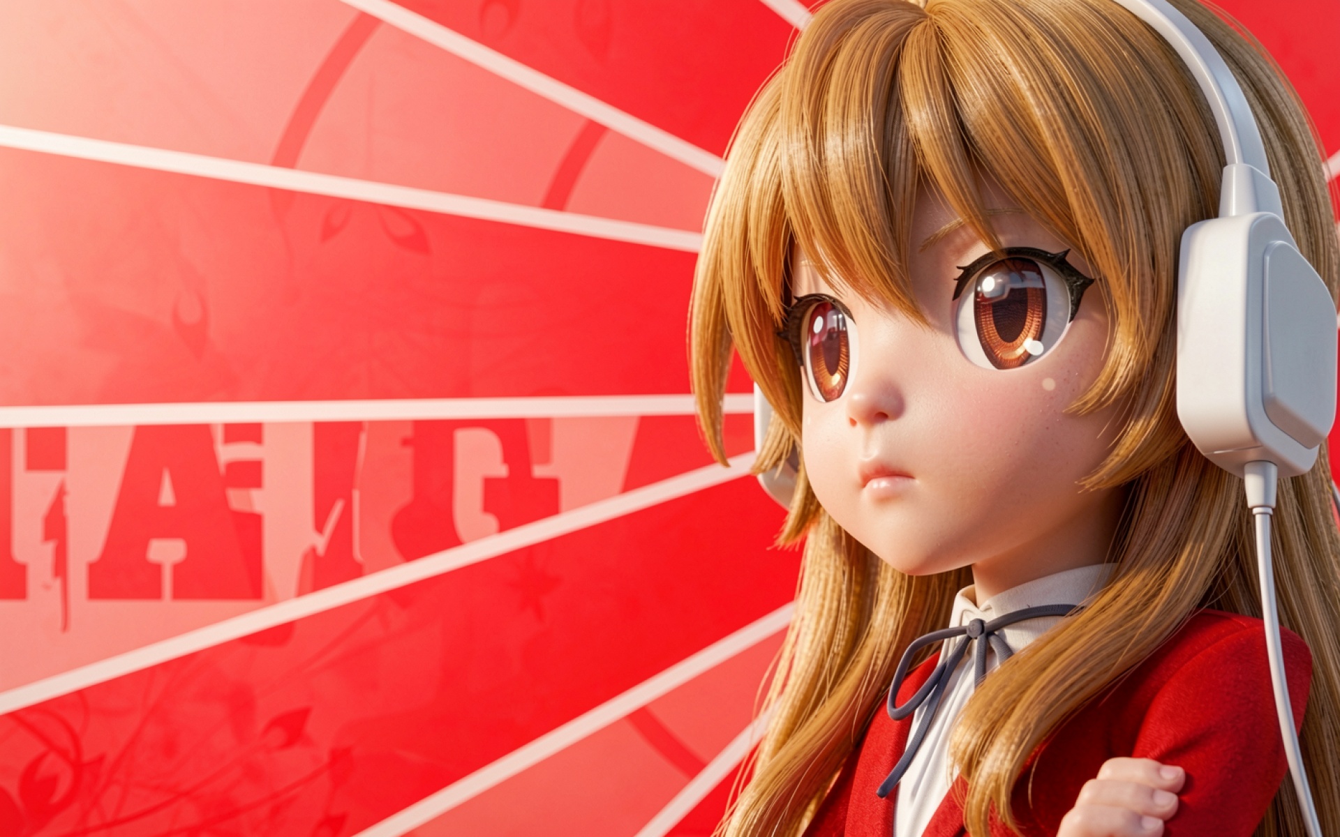 Аниме девушка в белых наушниках на красном фоне
