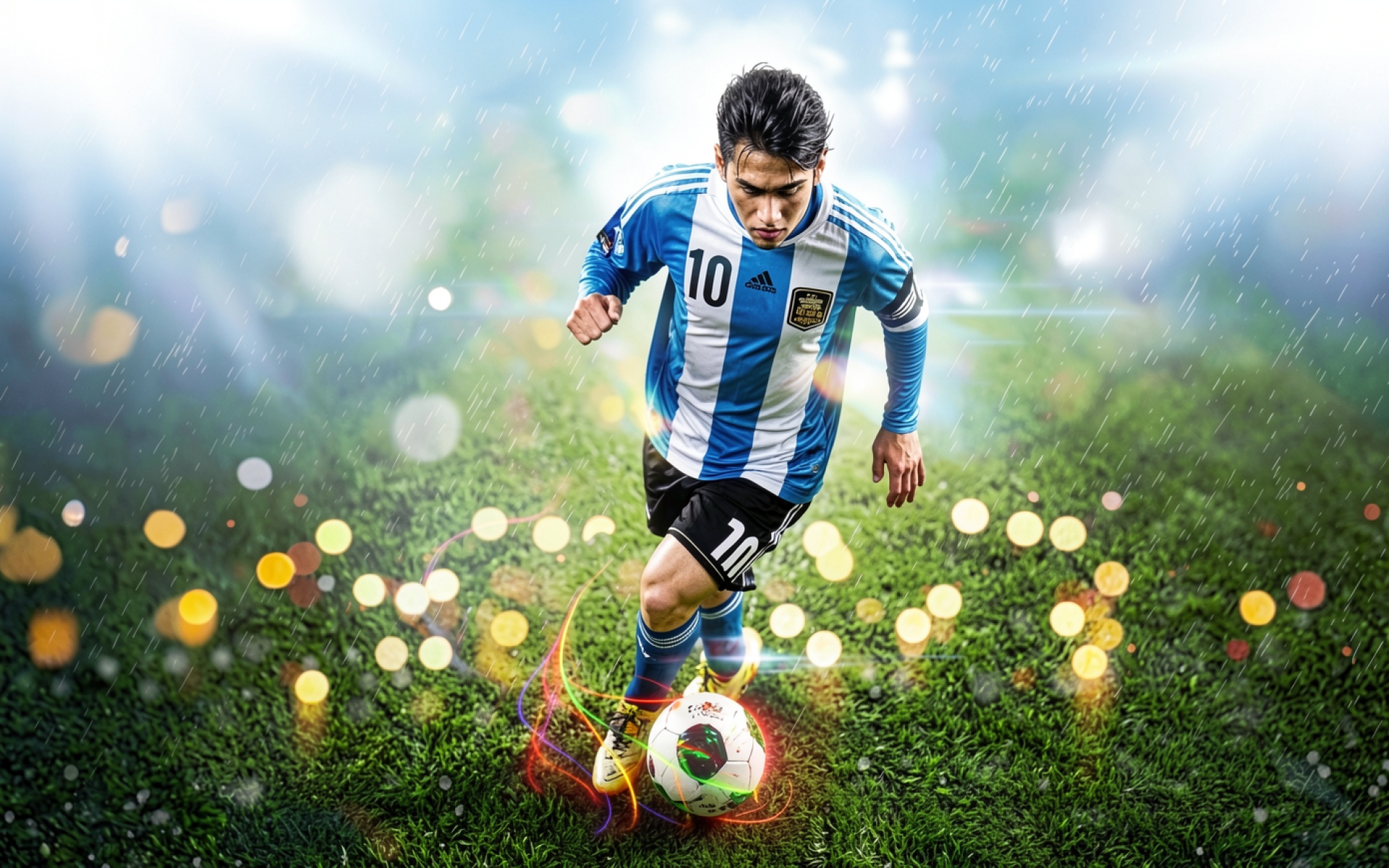 Футболист в форме Аргентины под дождем