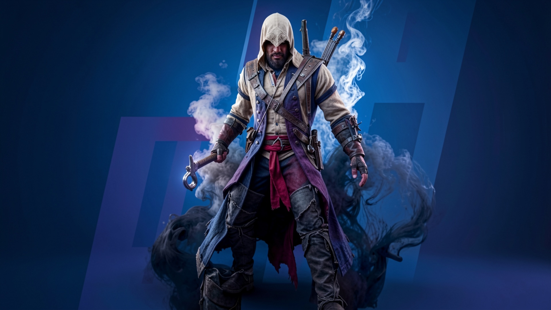 Ассасин в белом капюшоне среди синего дыма