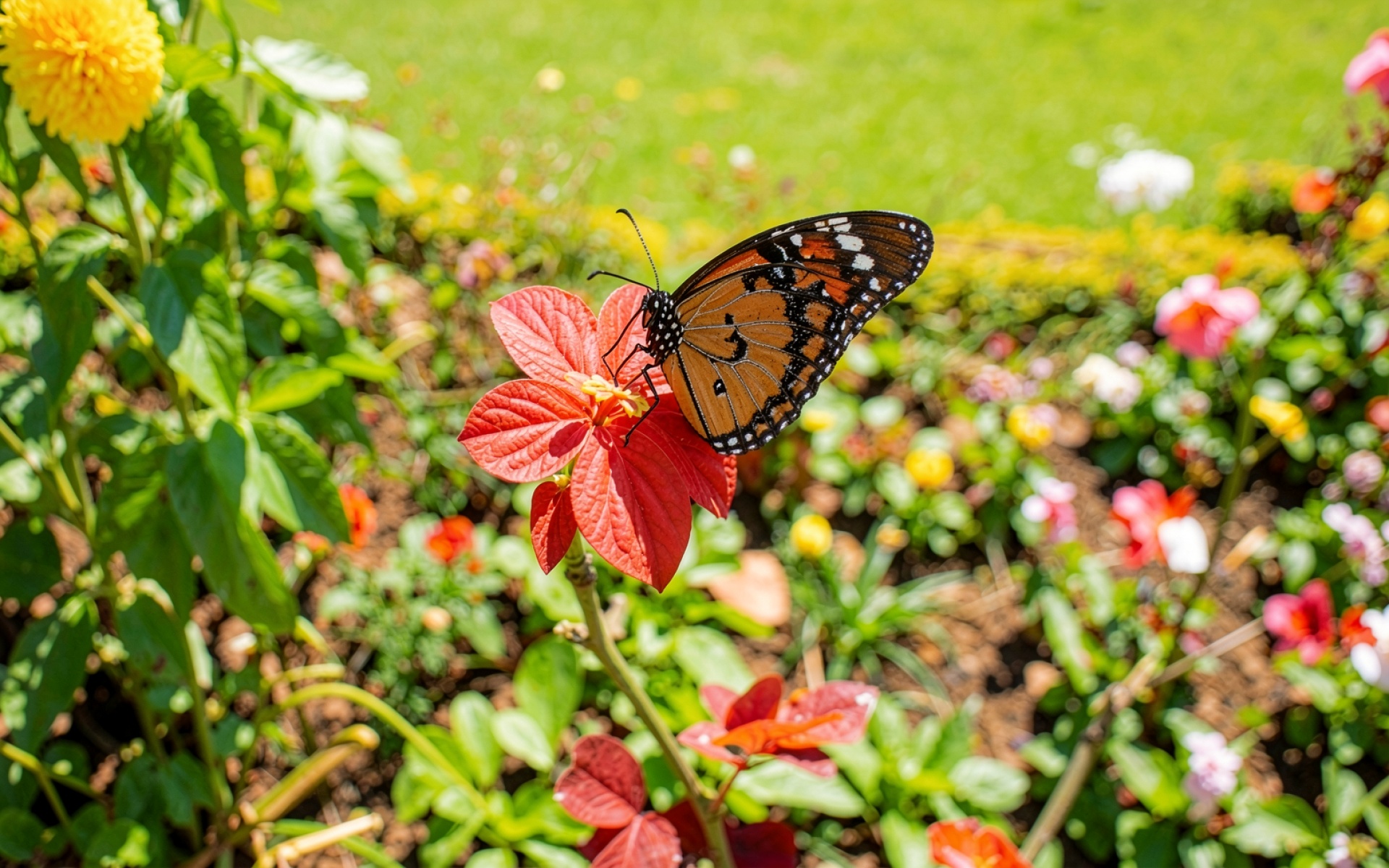 Оранжевая бабочка на красном цветке в саду