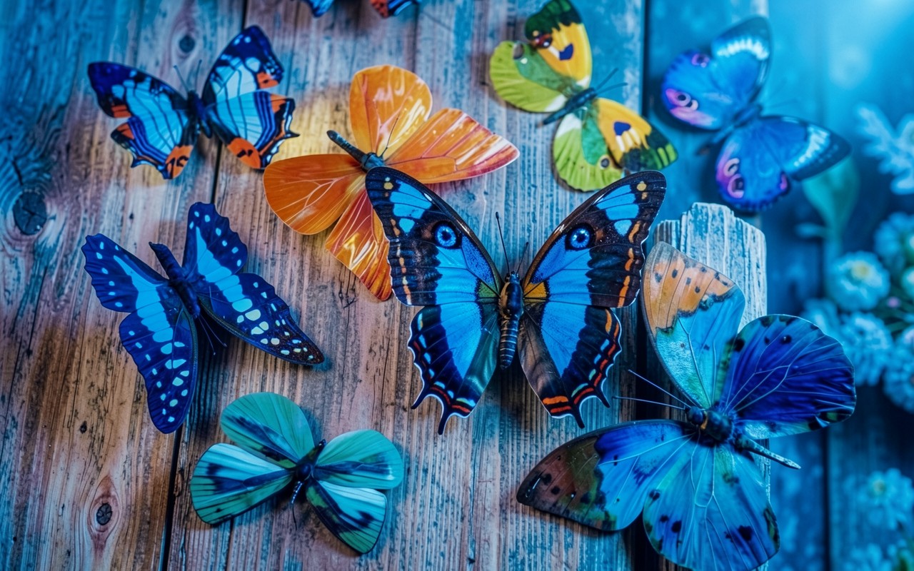 Разноцветные бабочки на старом деревянном фоне