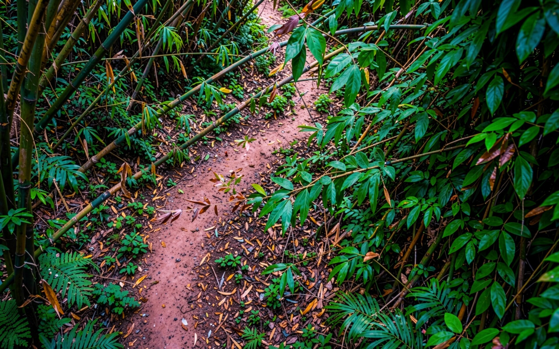 Узкая тропа в густом зеленом бамбуковом лесу