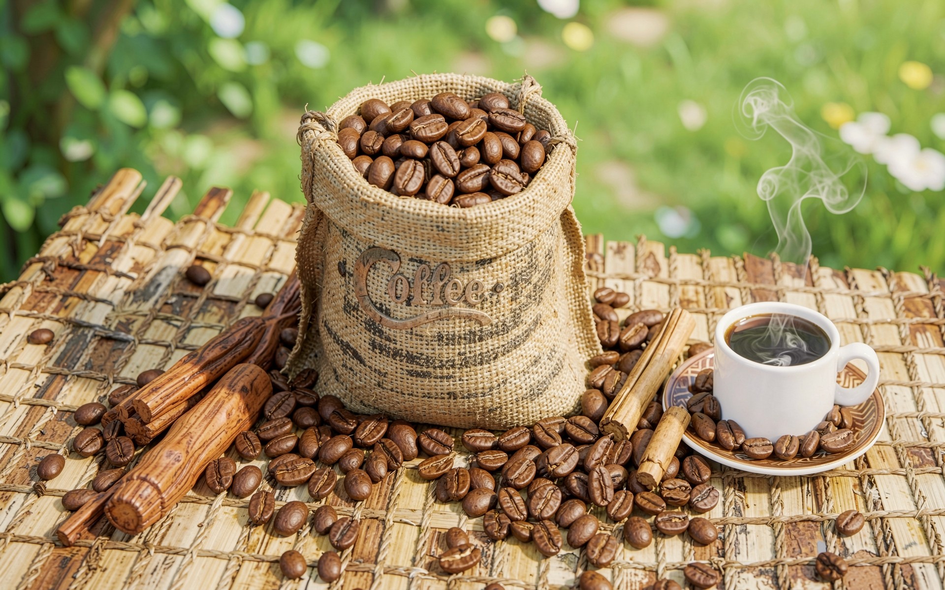 Мешок обжаренных кофейных зерен на бамбуковом столе