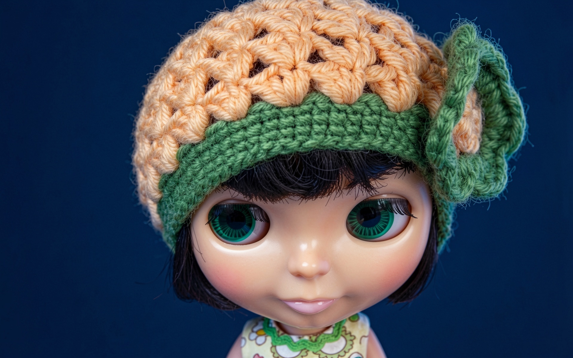 Кукла в вязаной шапке бежевого и зеленого цвета