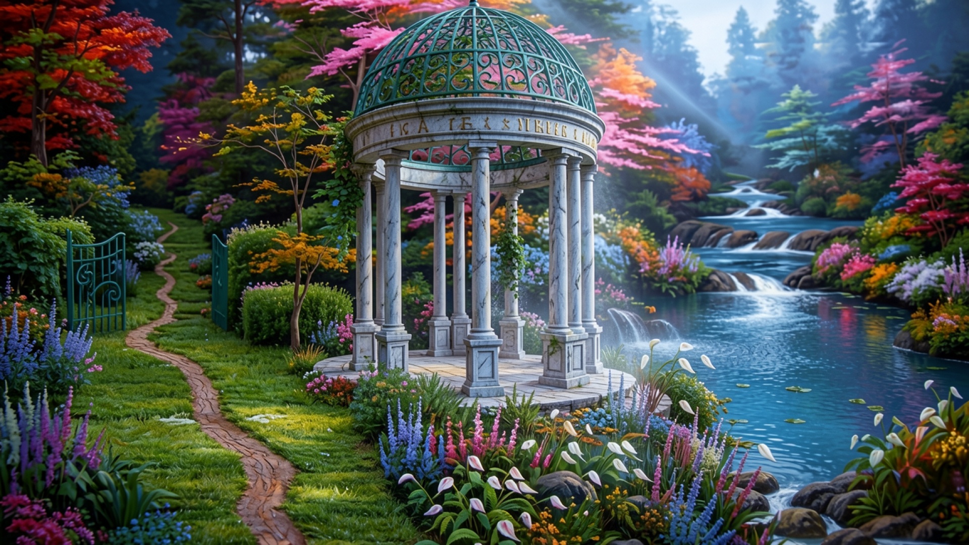 Белая мраморная ротонда в цветущем сказочном саду