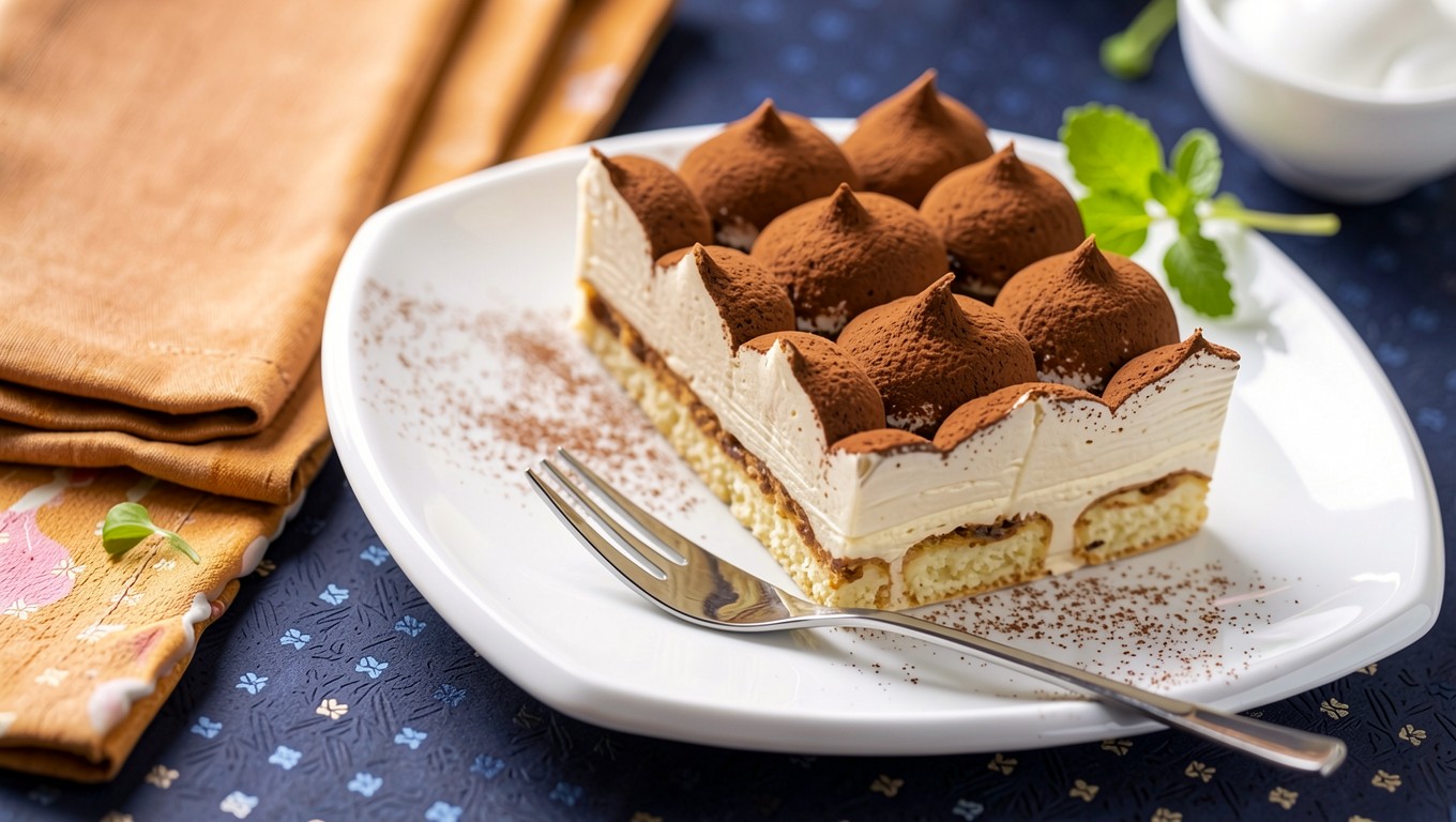 Кусок торта Тирамису на белой тарелке