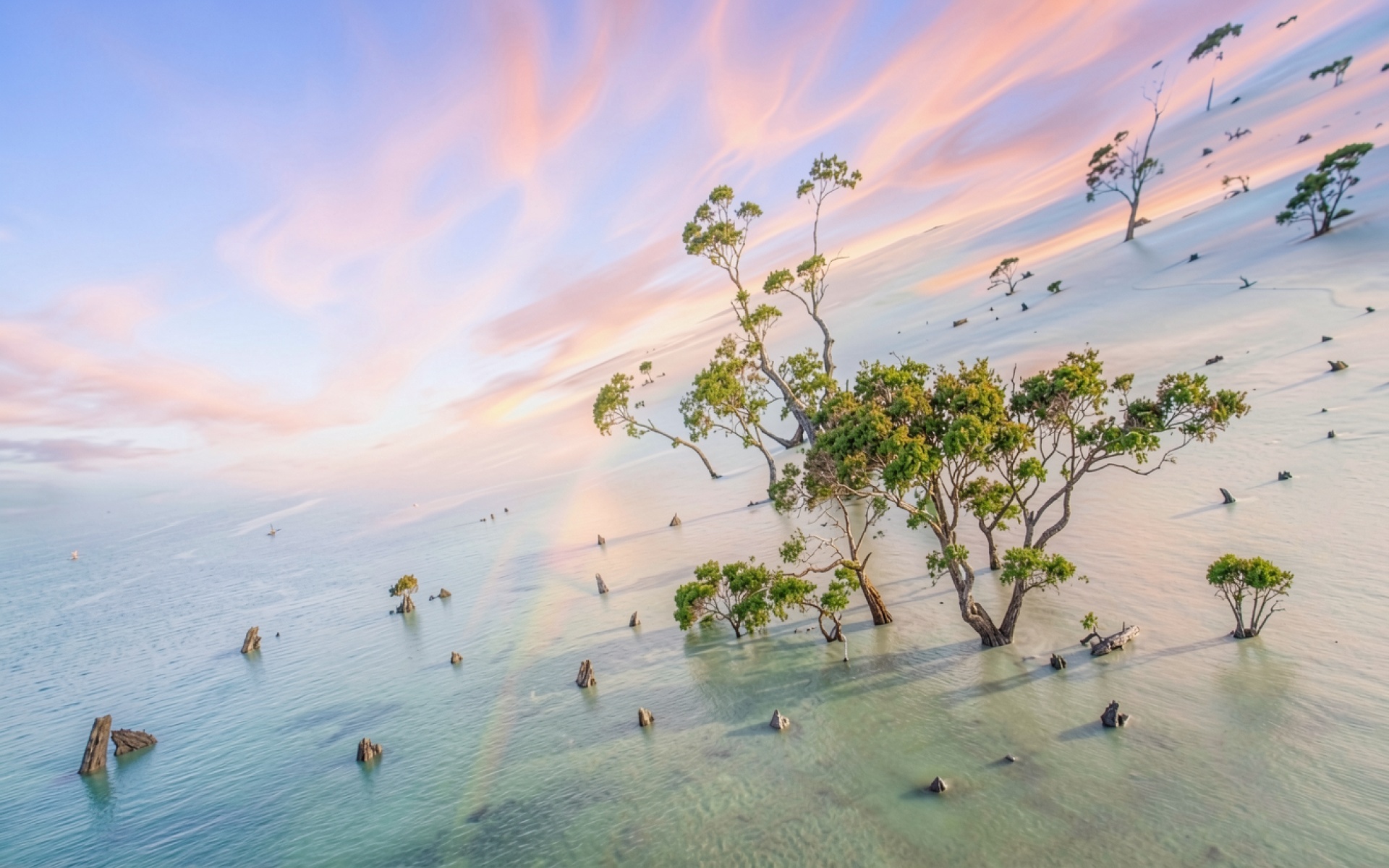 Одинокие деревья на белом песке у воды