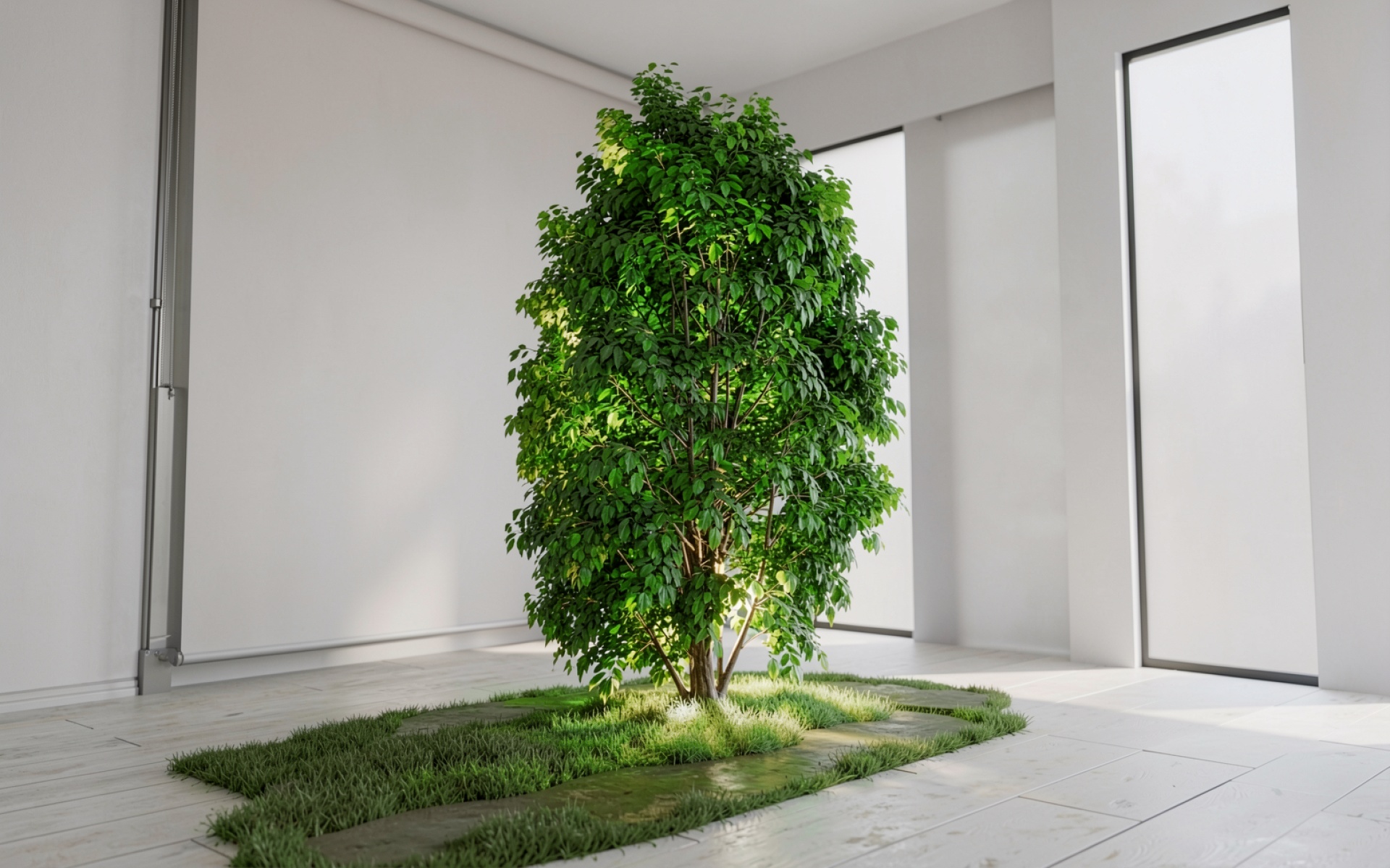 Зеленое дерево в белом минималистичном интерьере