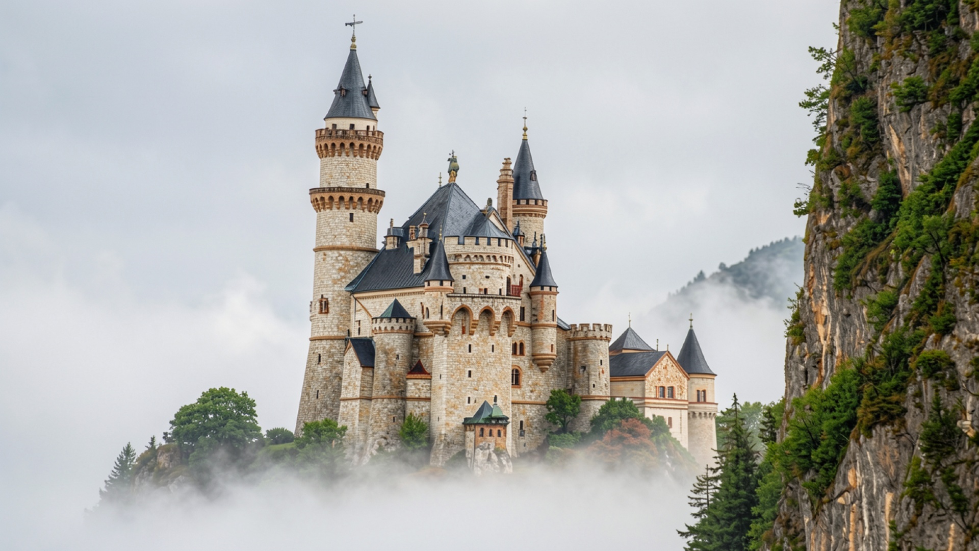 Средневековый замок в густом белом тумане