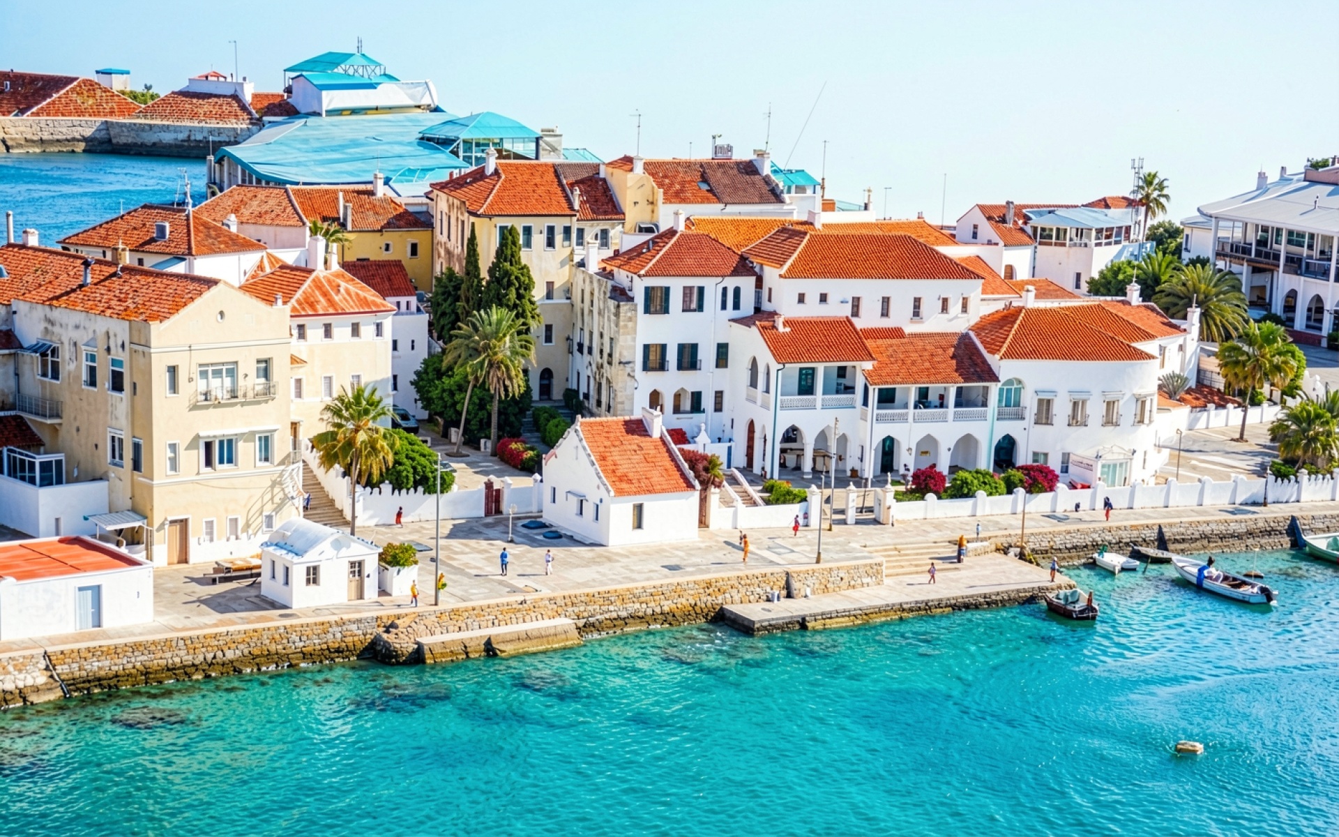 Белые дома с красными крышами у бирюзового моря