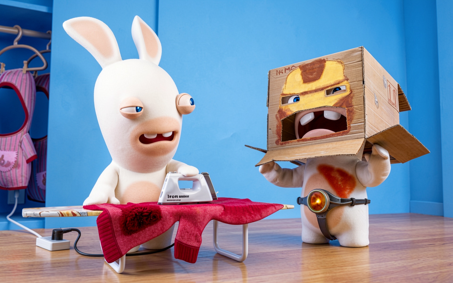 Белые кролики с утюгом в синей комнате