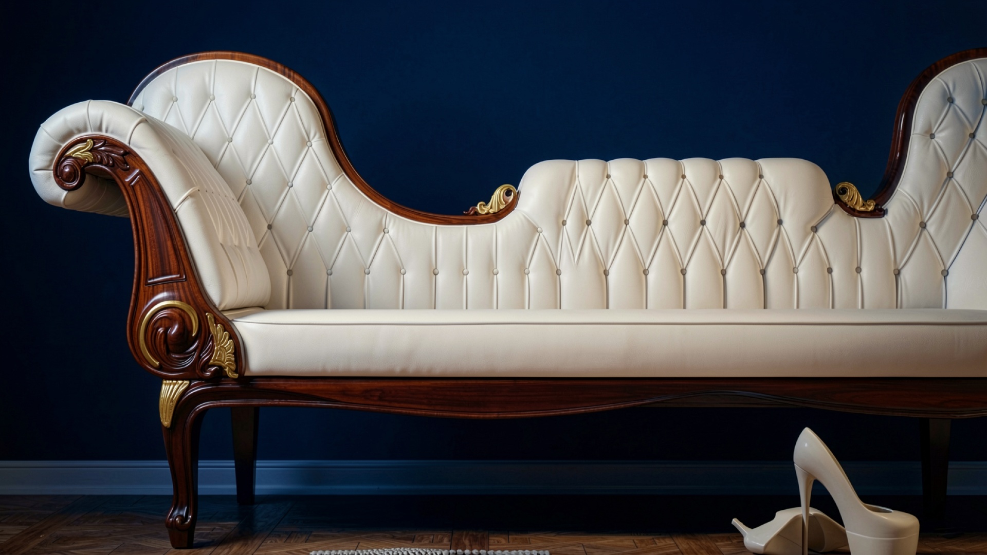 Белый кожаный диван рококо на синем фоне