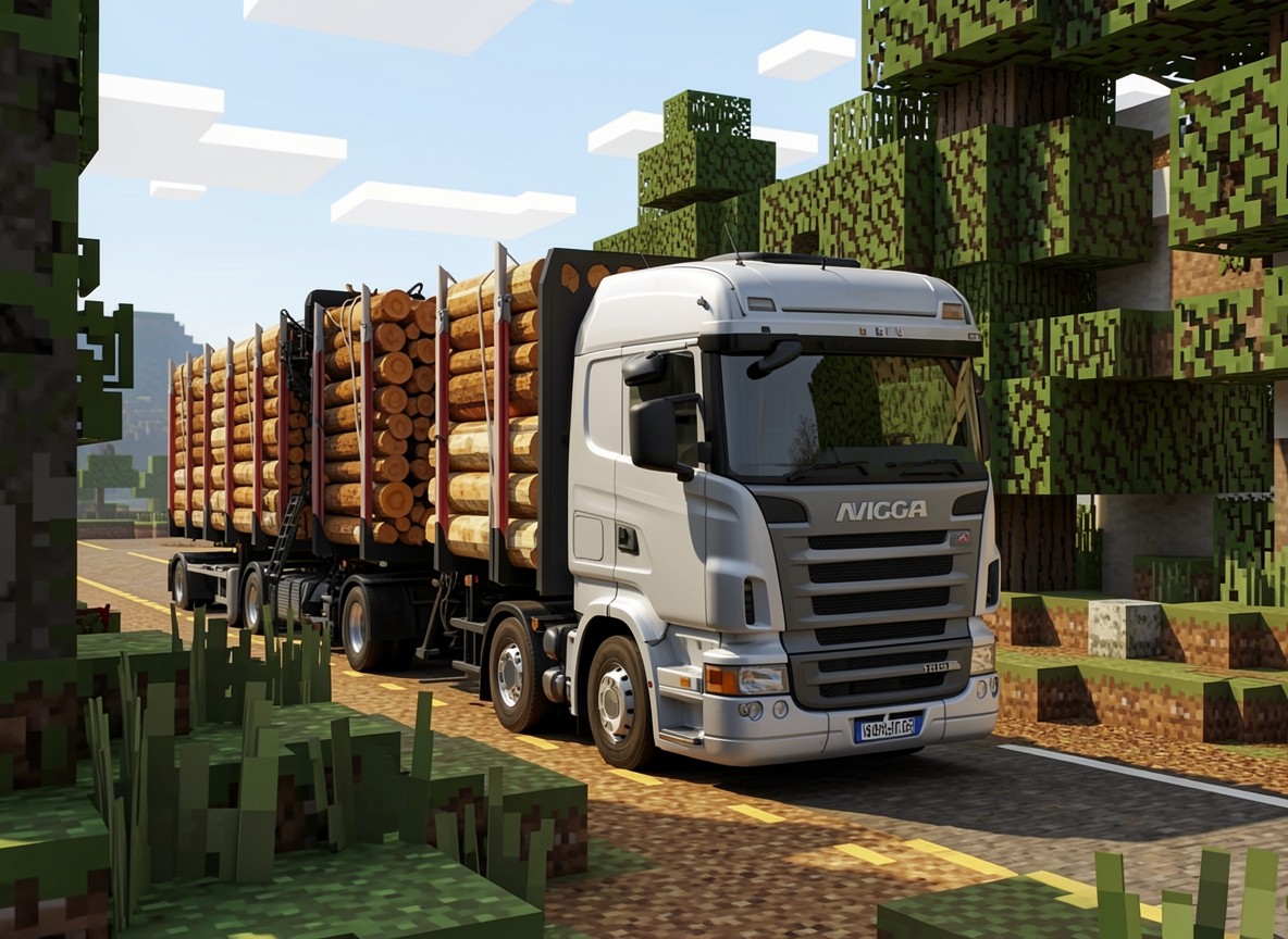 Белый лесовоз с бревнами в мире Minecraft