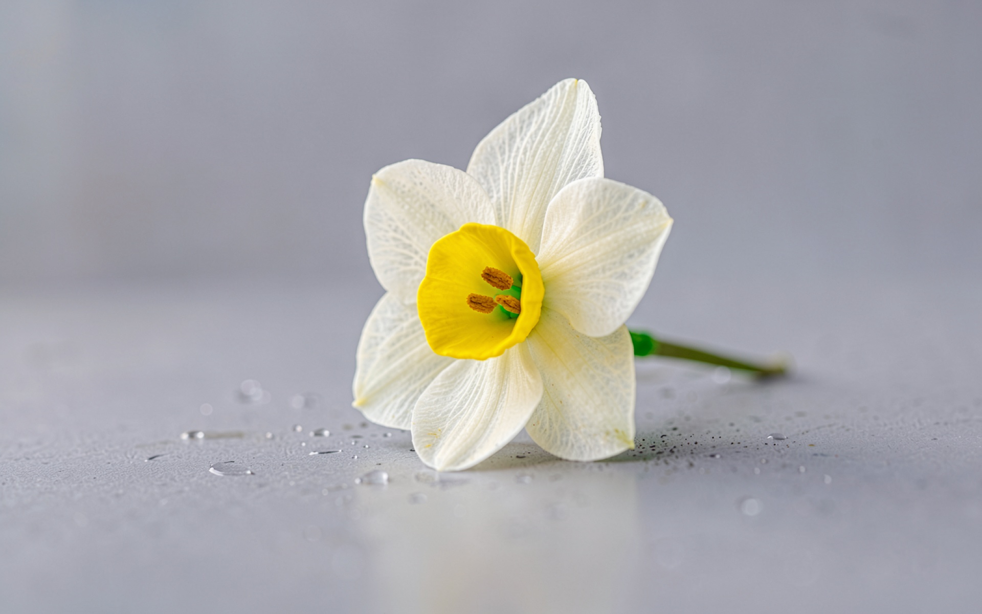 Белый нарцисс с желтой сердцевиной на сером фоне