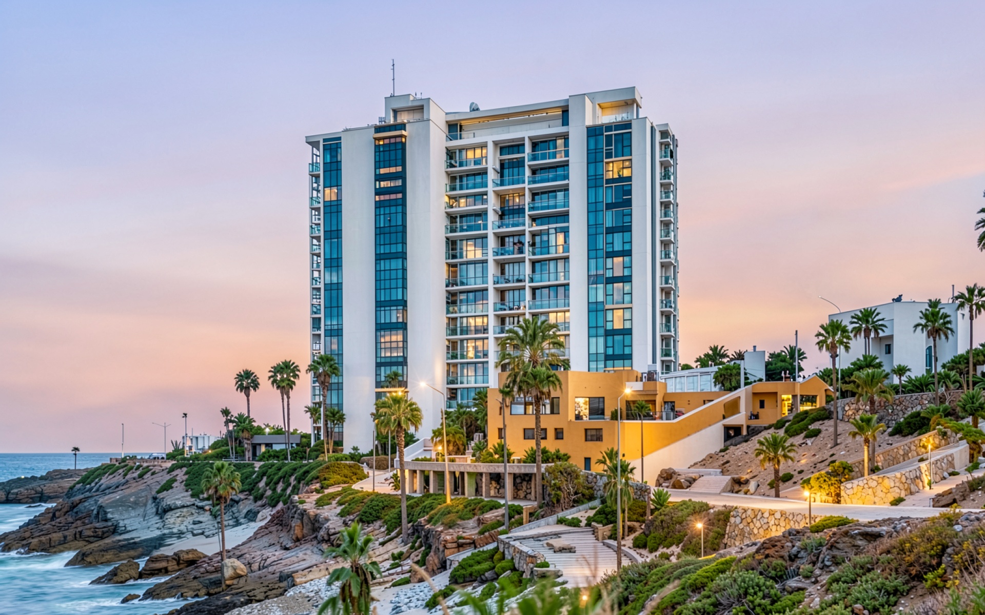 Современный белый отель на скалистом берегу океана