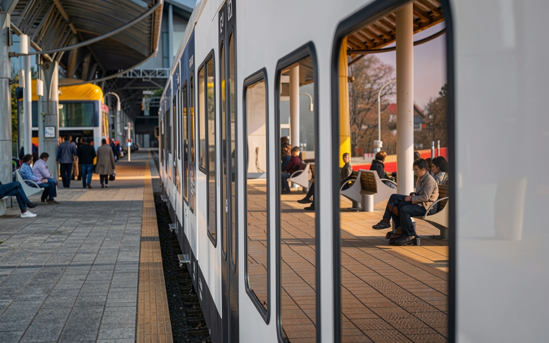 Белый современный поезд на перроне вокзала
