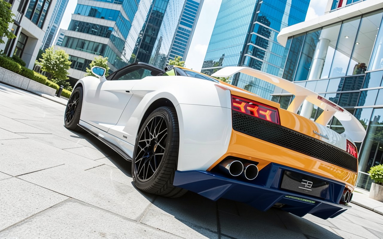 Белый спорткар Maserati в современном городском квартале