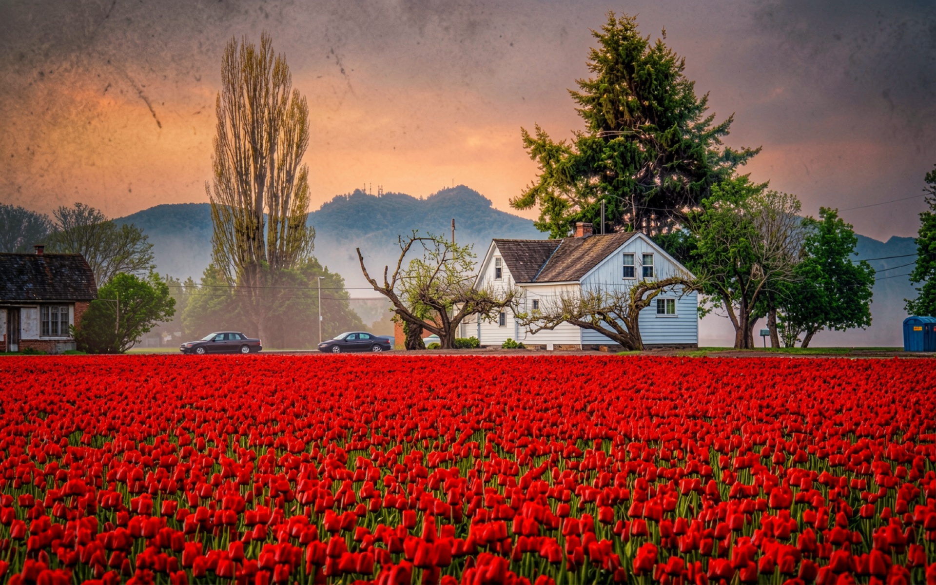 Поле красных тюльпанов с белым домом