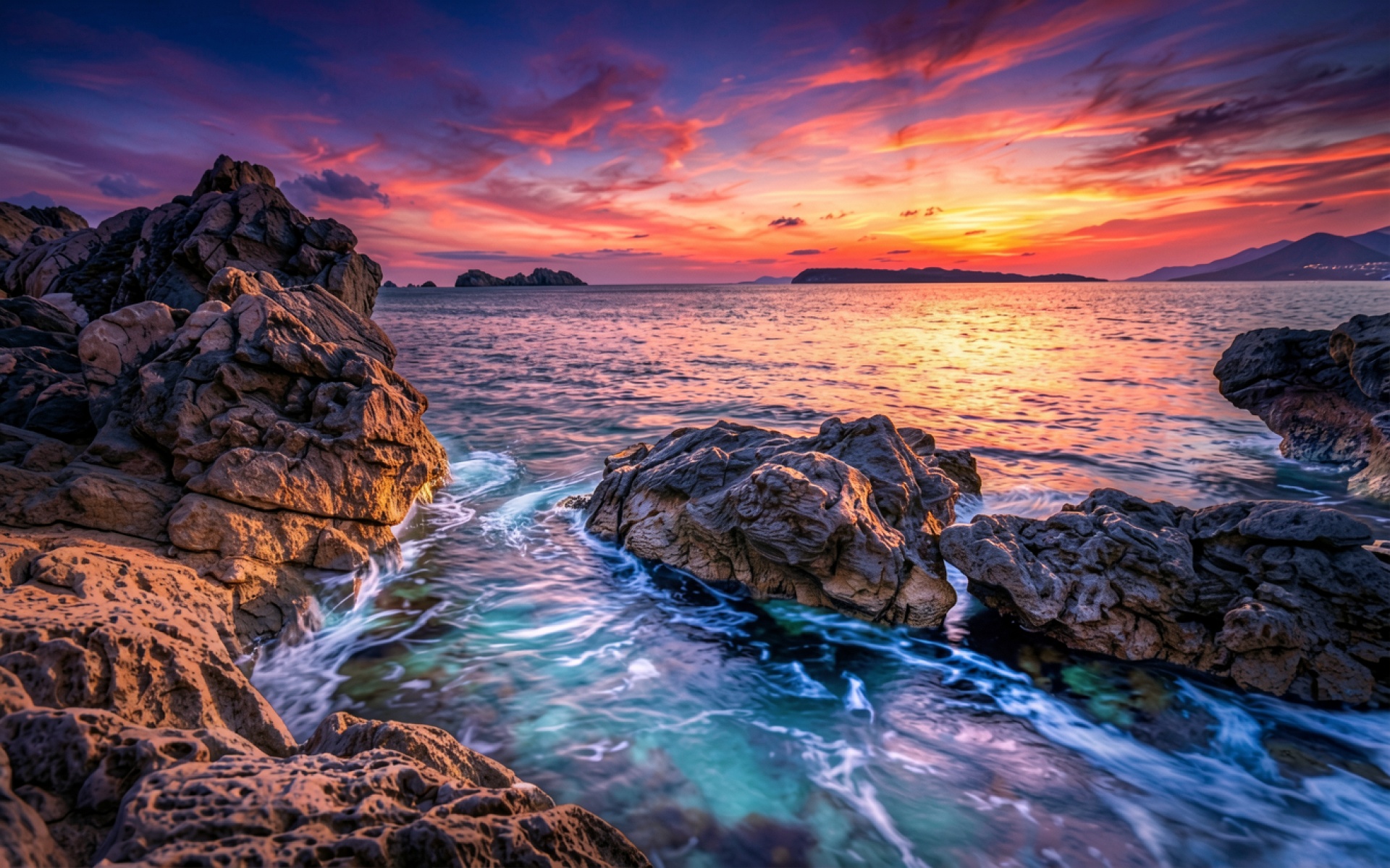 Закат над скалистым берегом синего океана