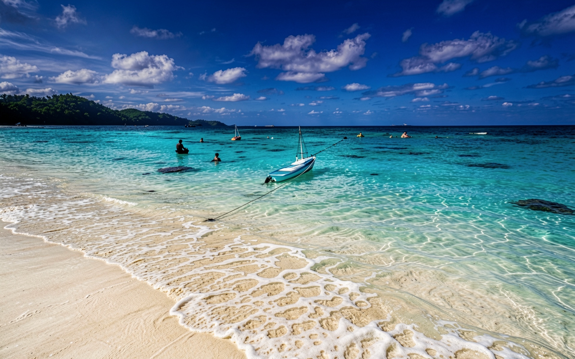 Белый парусник на бирюзовом берегу пляжа