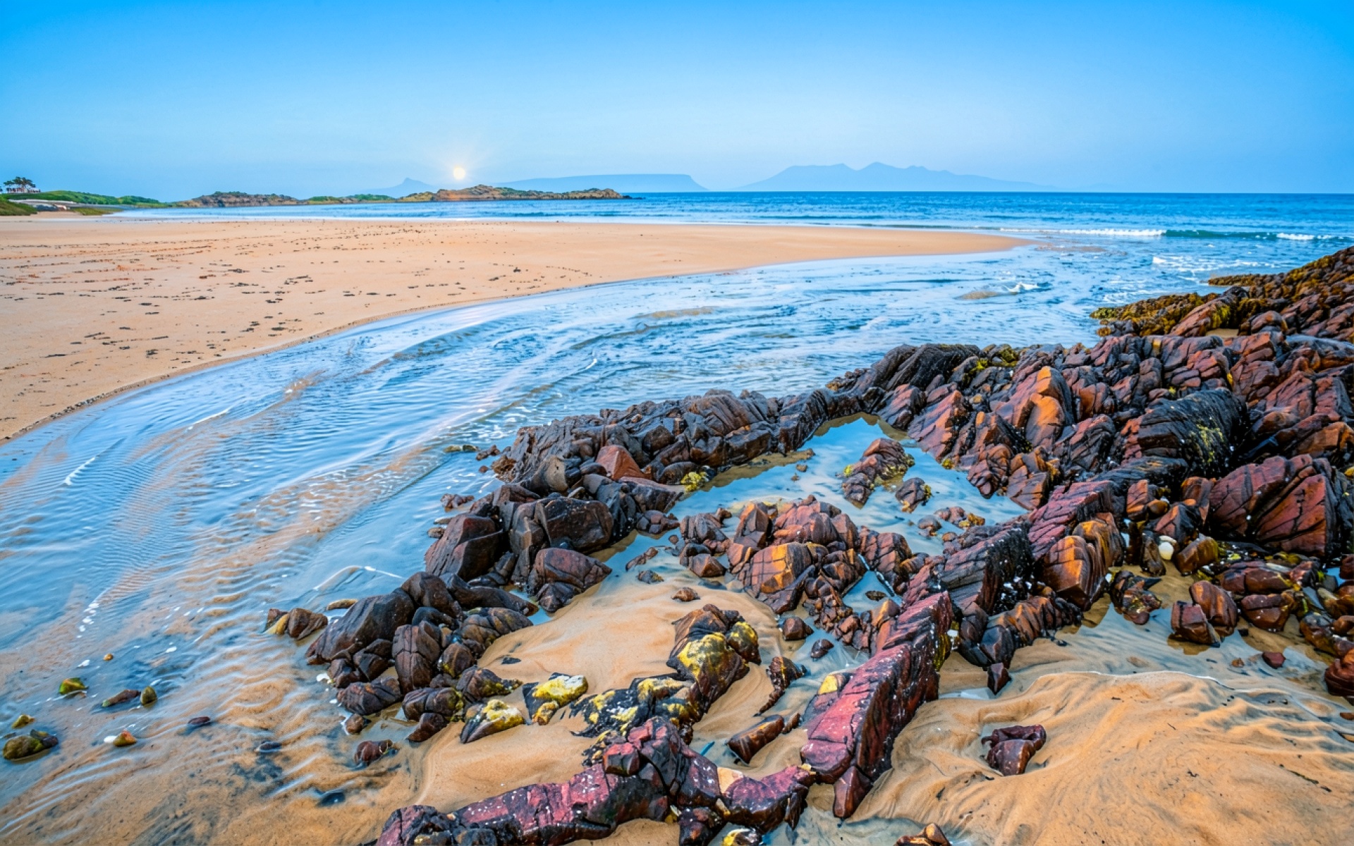 Красные скалы на песчаном берегу океана