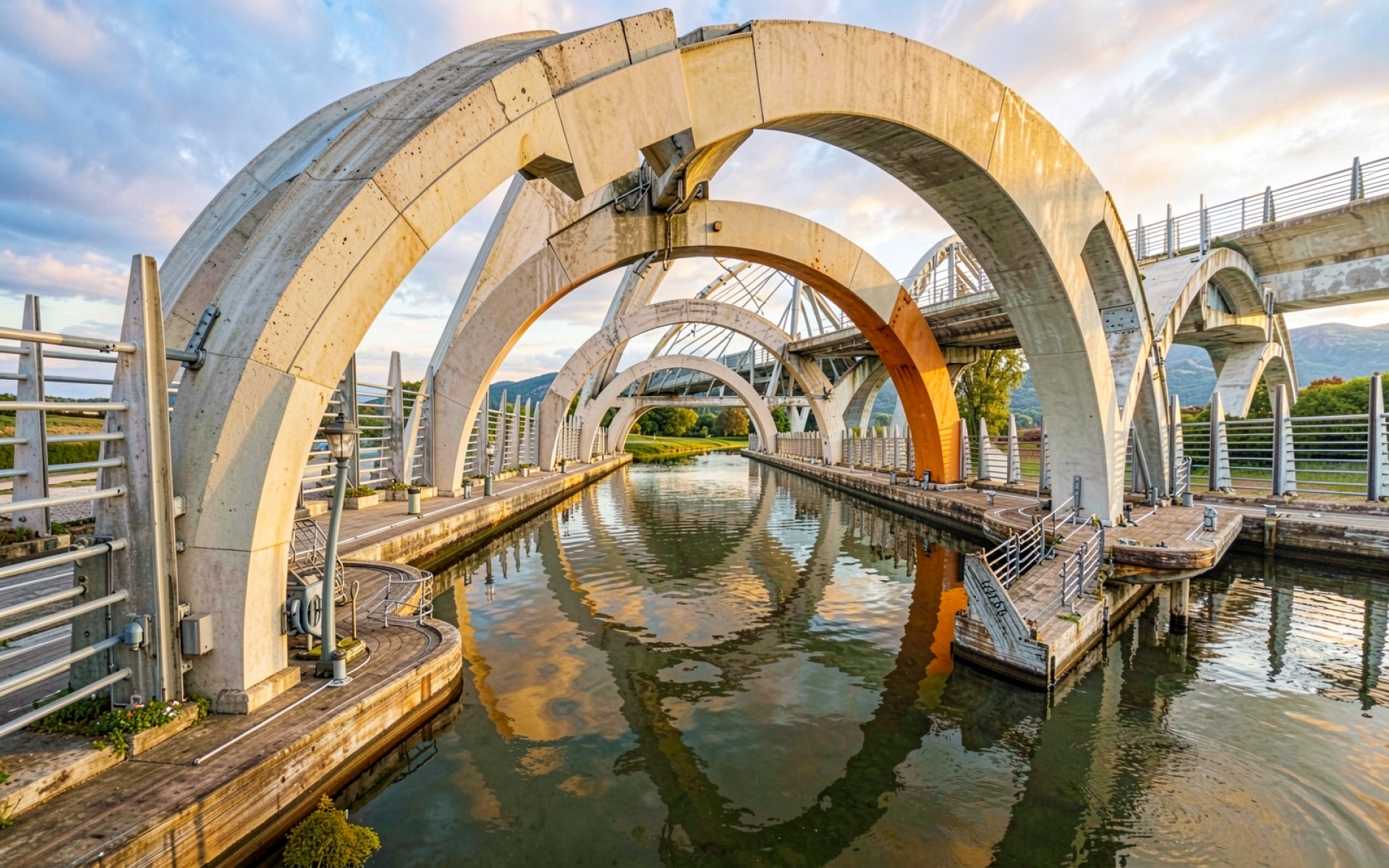 Бетонный мост-акведук над каналом в закатном свете