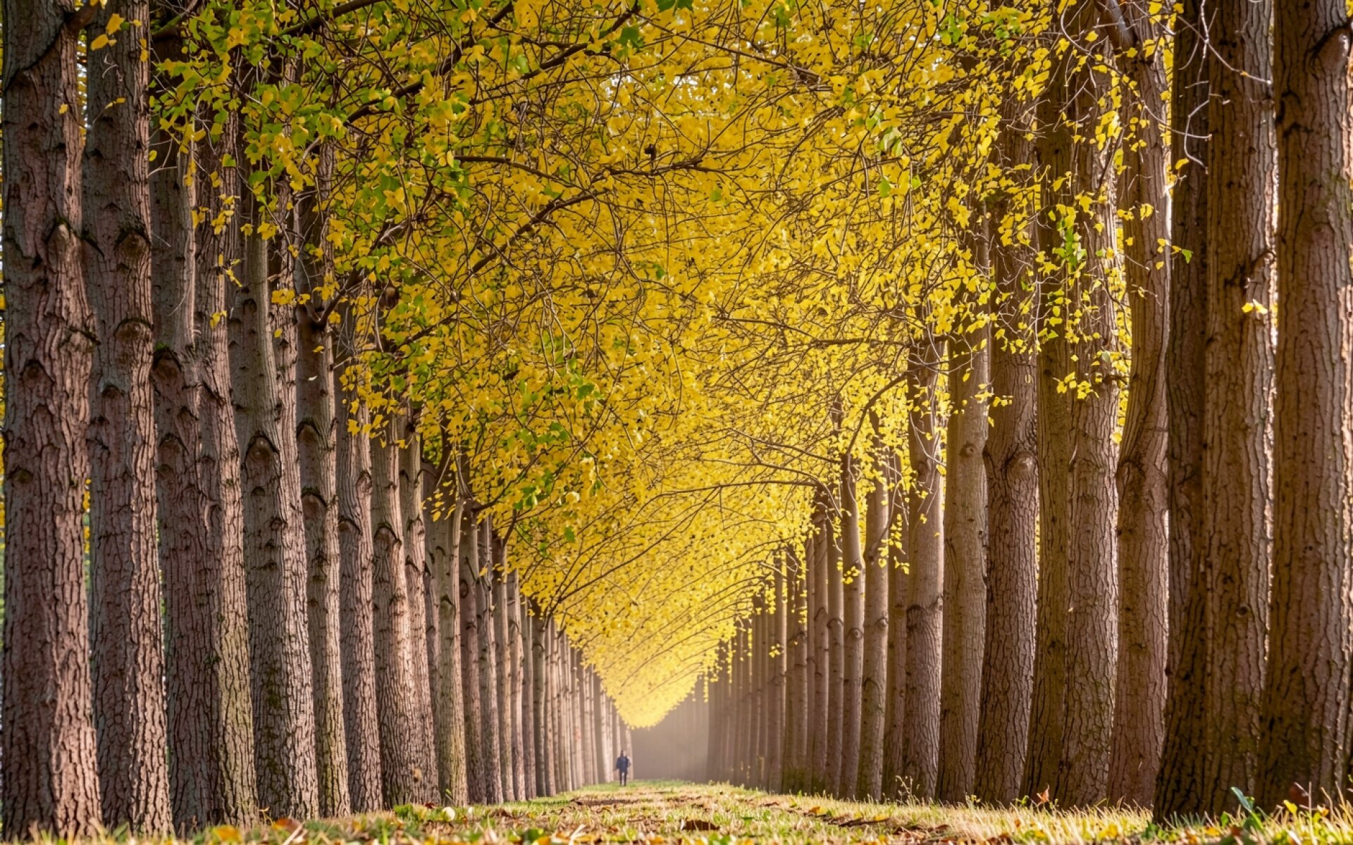 Аллея желтых гинкго билоба в тумане