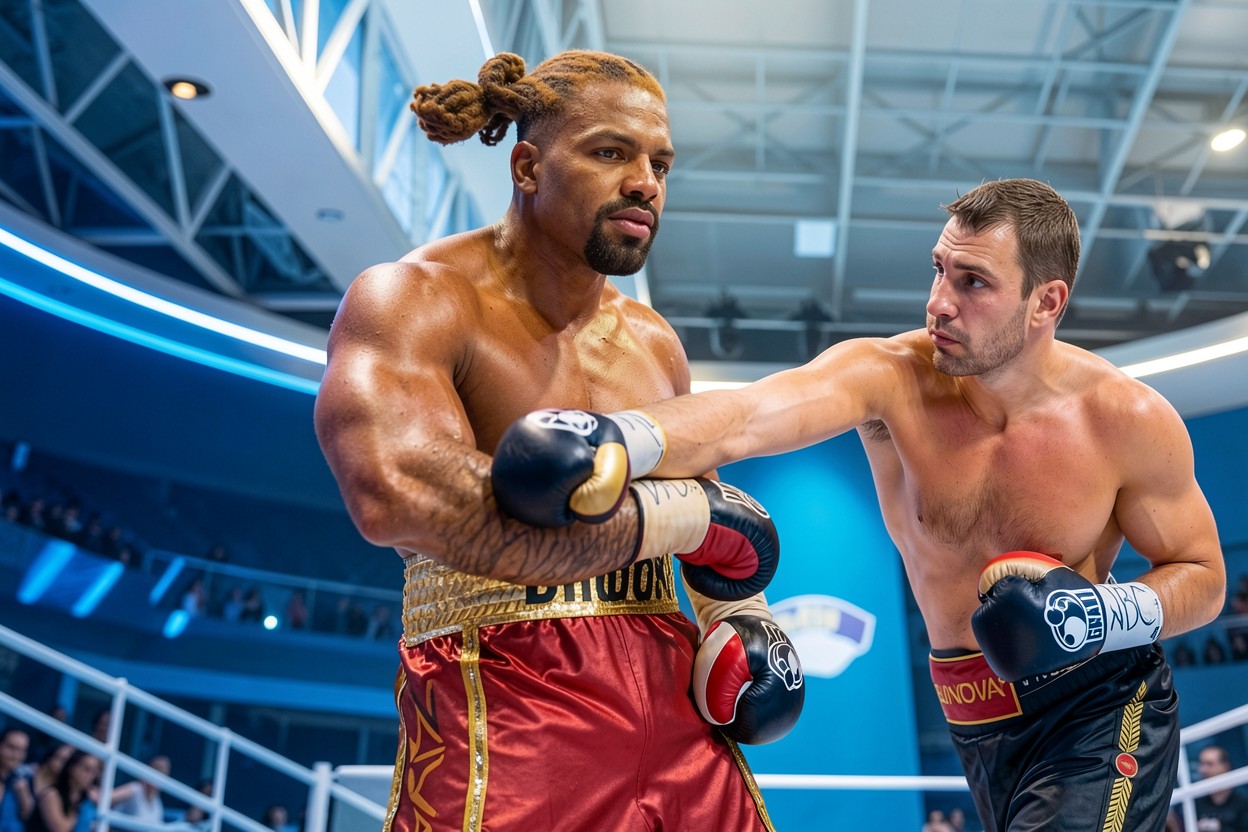 Боксеры в красных и черных шортах на ринге