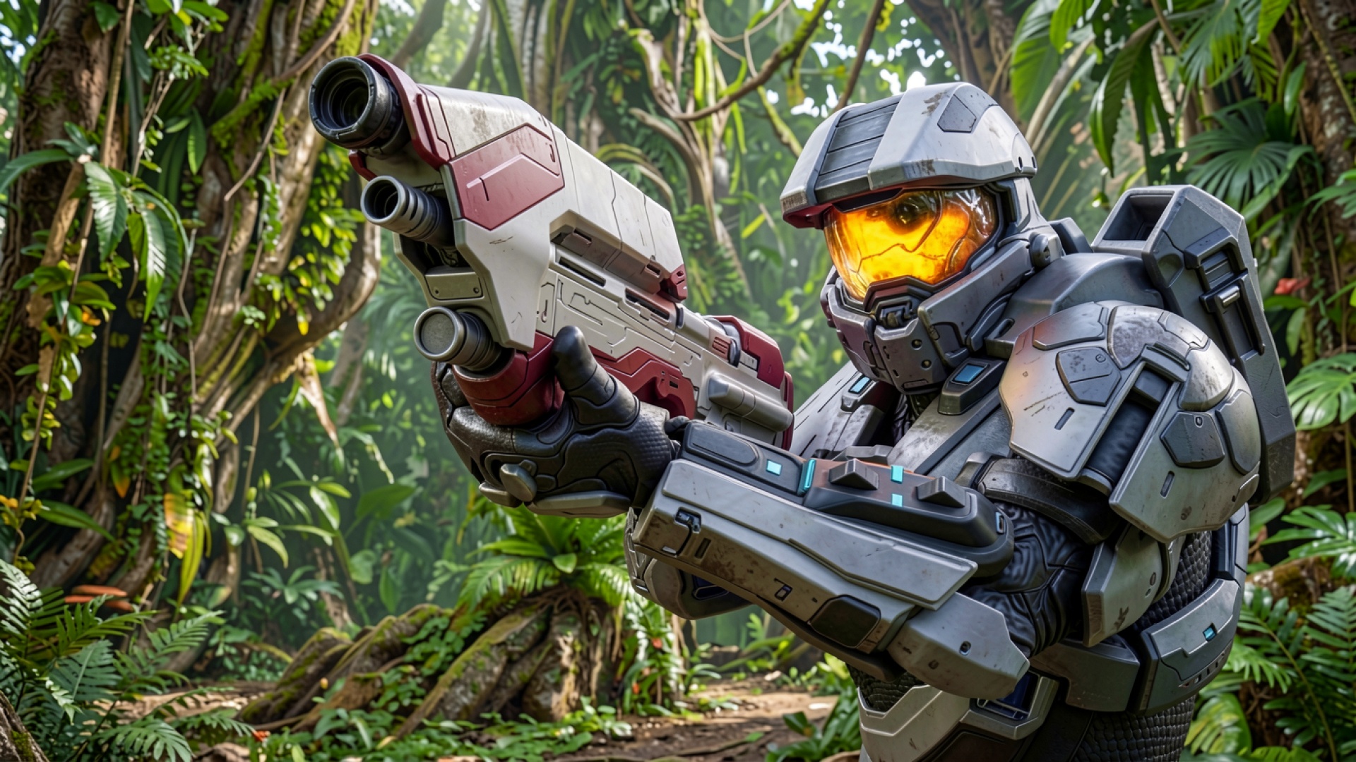 Воин в серой броне с оружием в джунглях