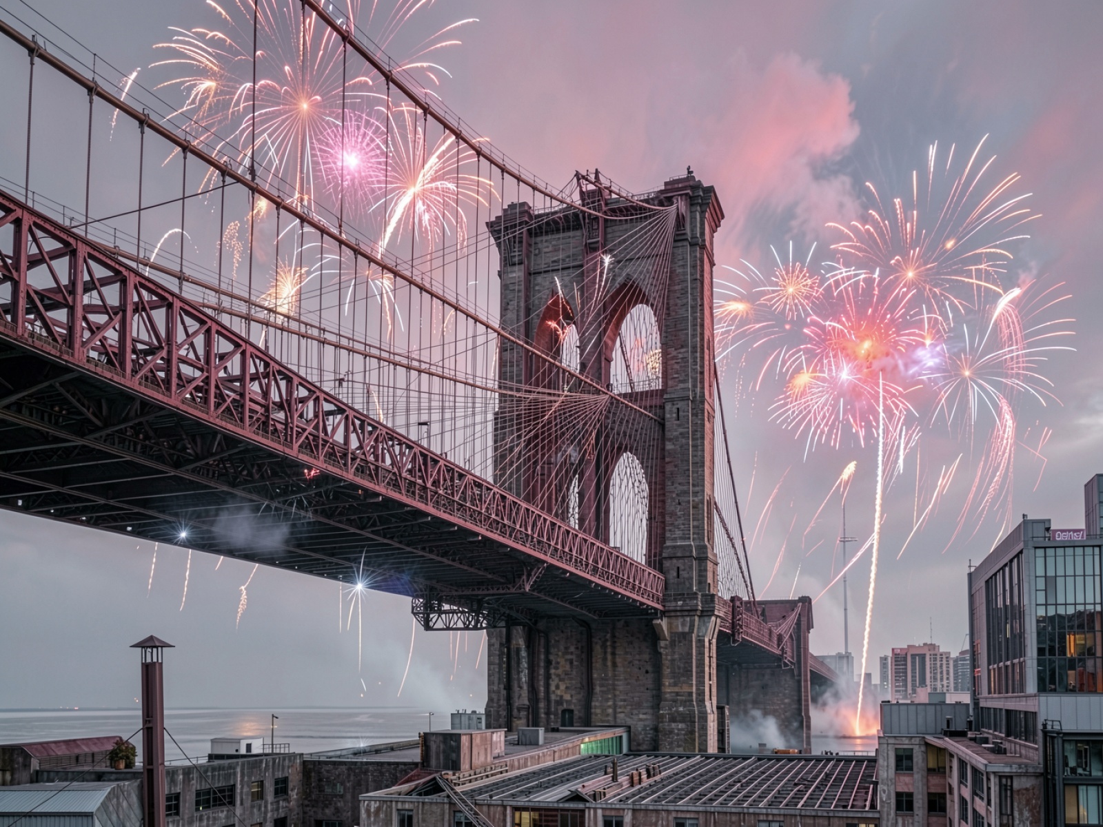 Бруклинский мост с фейерверками в розовом небе