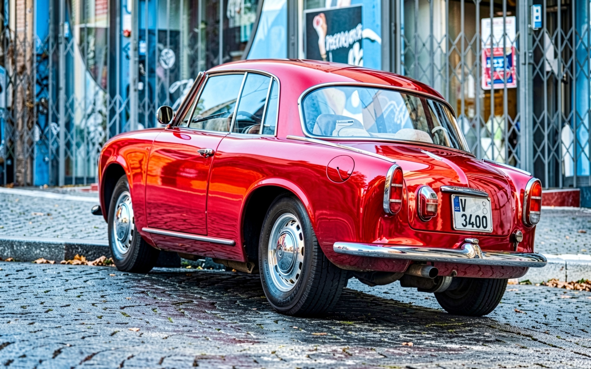 Красный классический автомобиль на брусчатке города