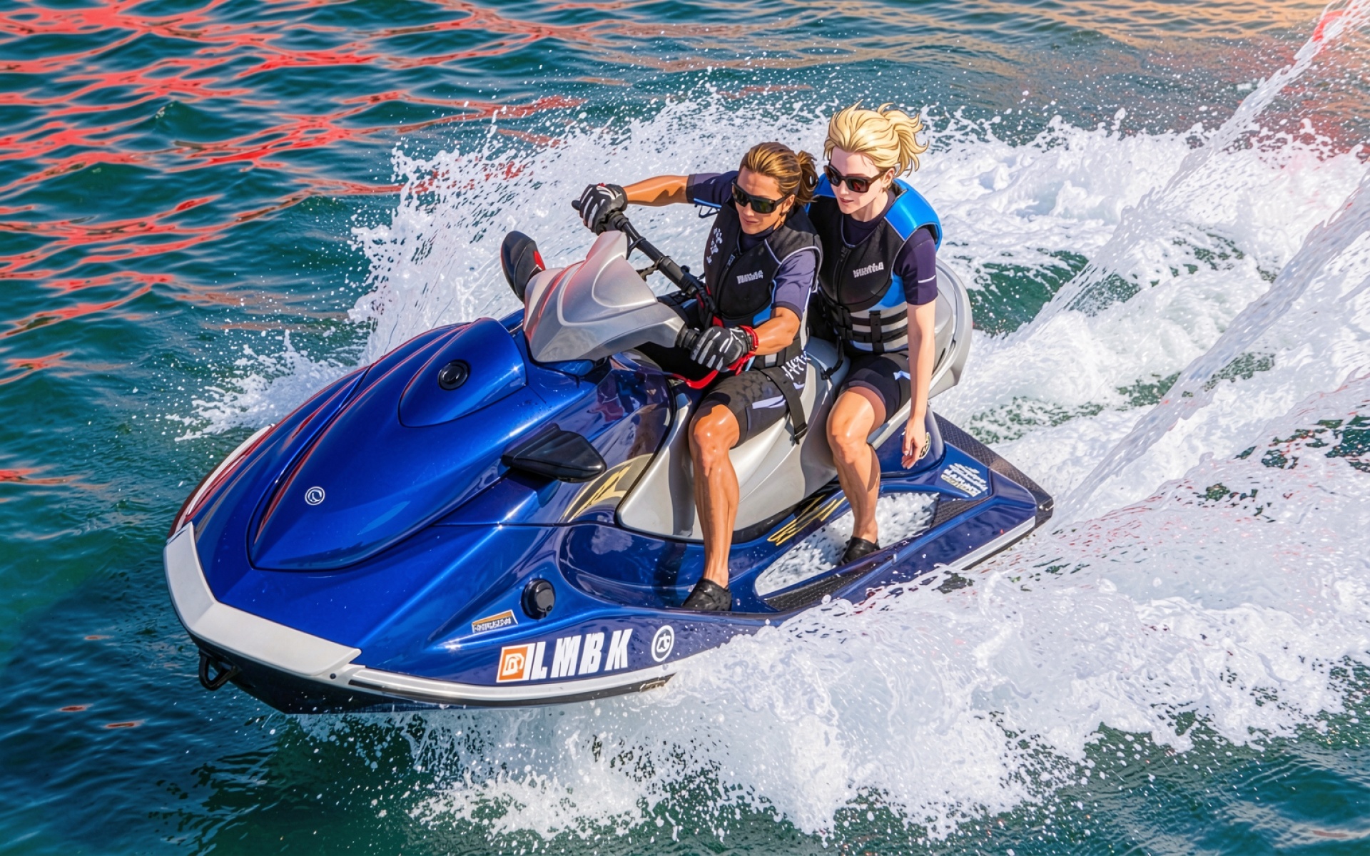 Синий гидроцикл с двумя девушками в брызгах воды
