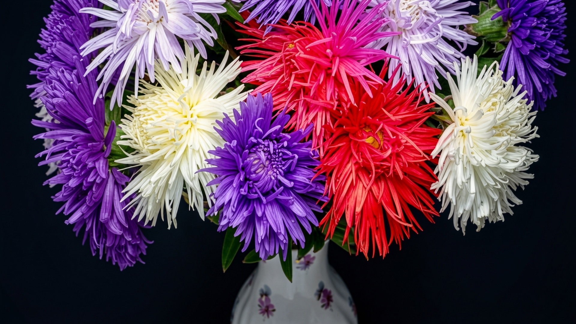 Букет разноцветных астр в белой вазе