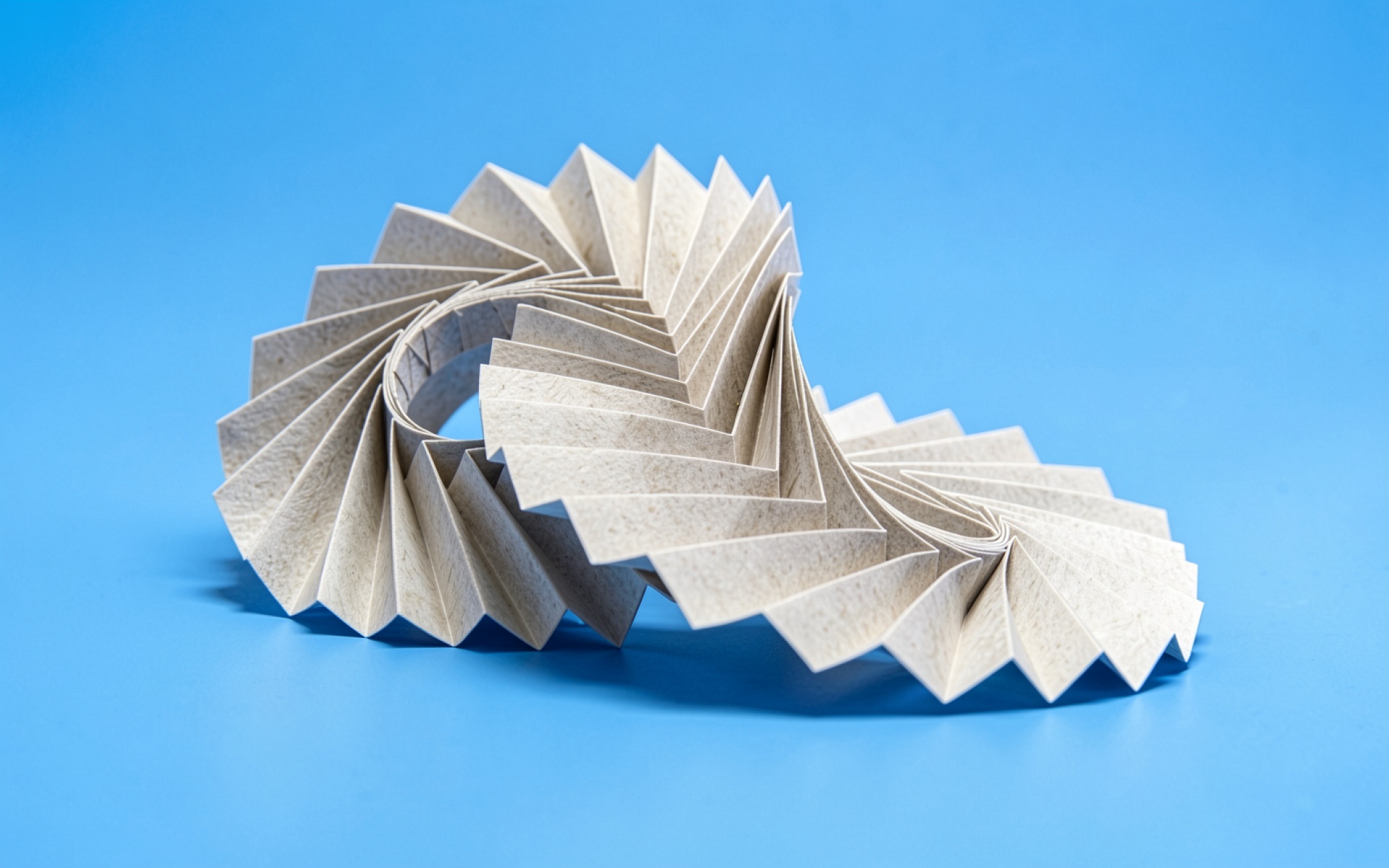 Бумажная спиральная скульптура бежевого цвета на синем фоне