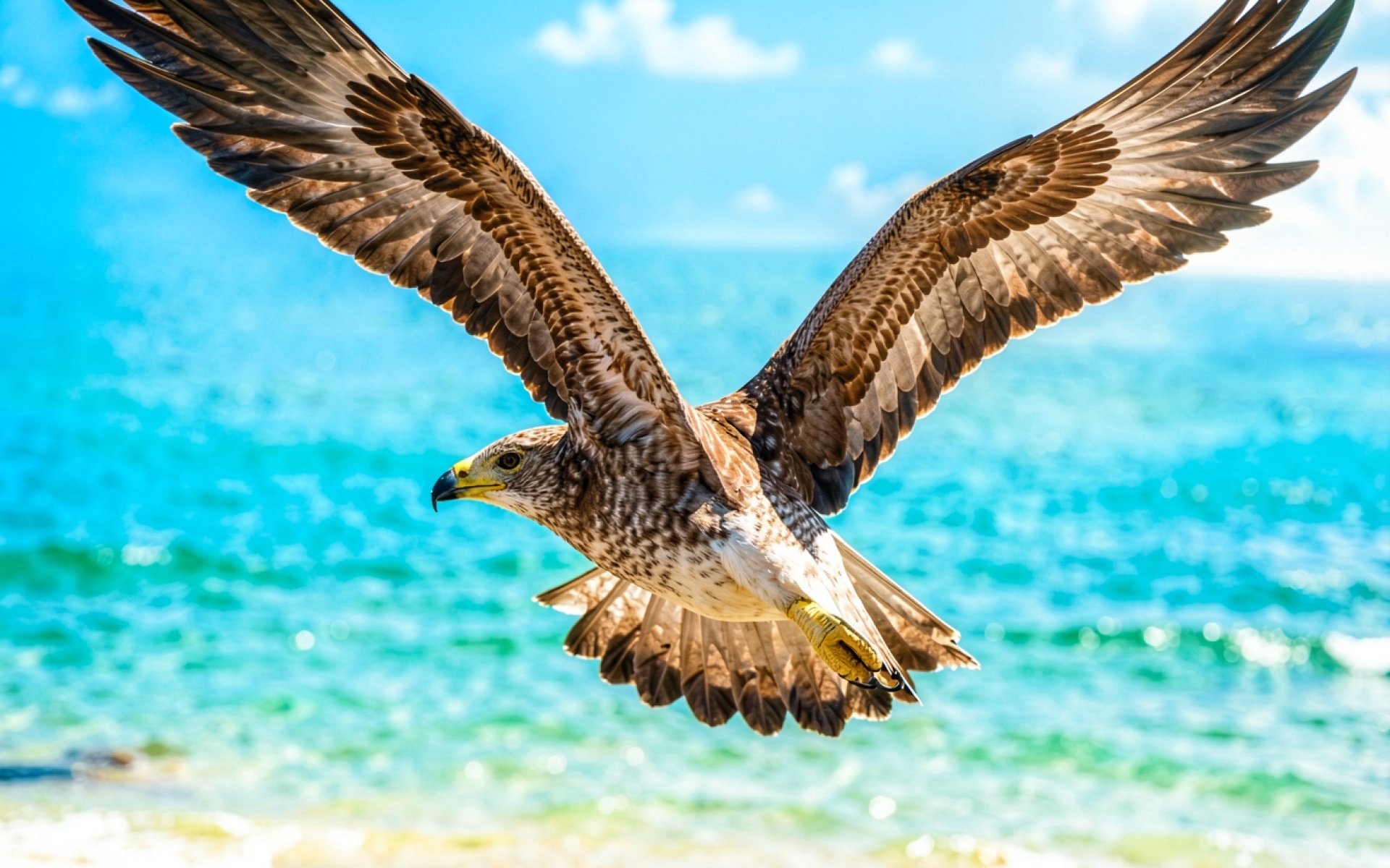 Бурый ястреб в полете над бирюзовым морем