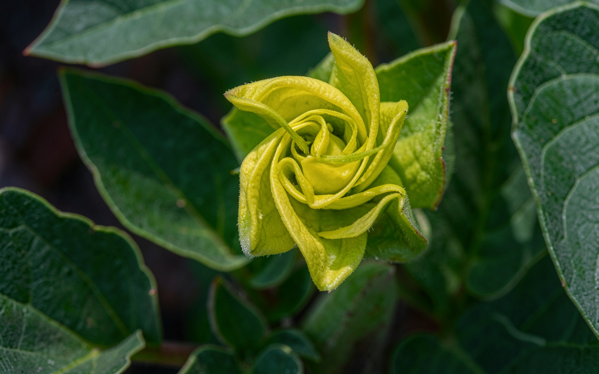 Желтый бутон цветка среди зеленых листьев