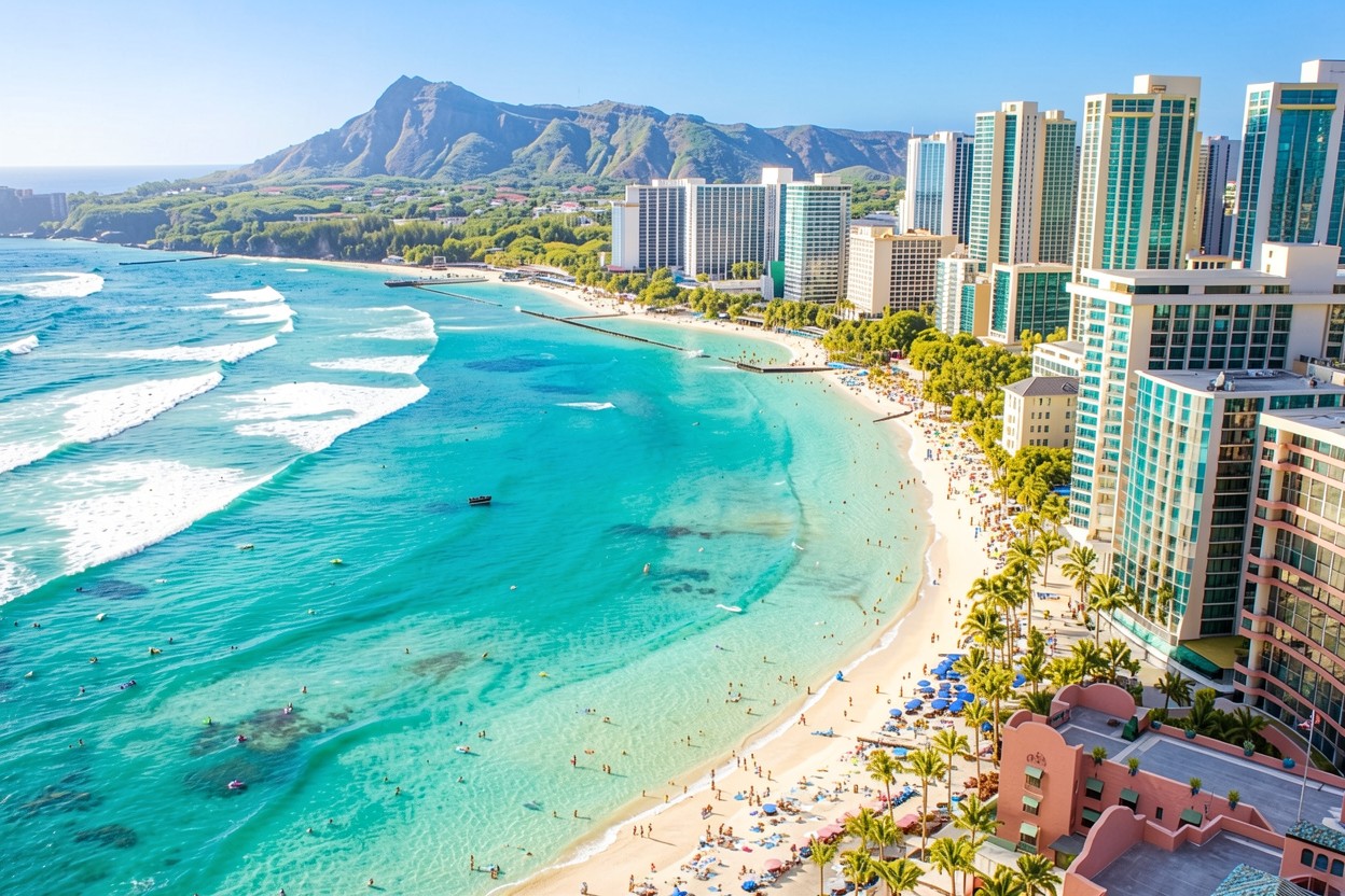 Пляж Вайкики с бирюзовой водой и небоскребами