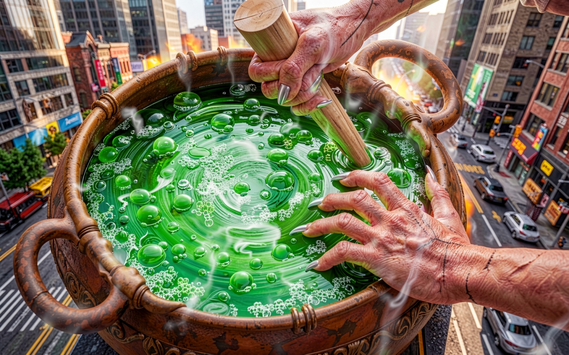 Ведьмин котел с зеленым зельем в городе