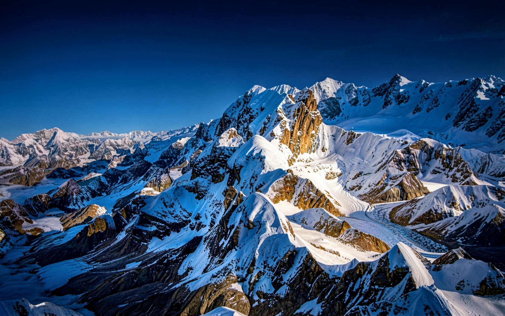 Заснеженные горные вершины в синем сумеречном свете