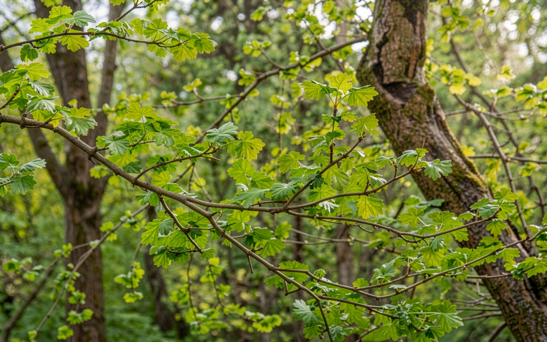 Зеленые листья дуба в весеннем лесу