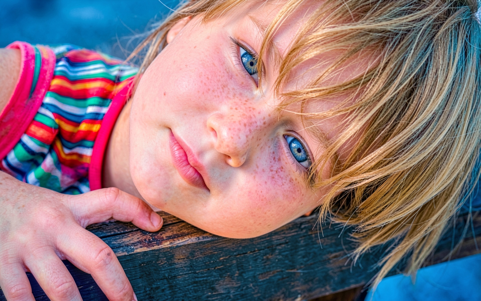 Рыжеволосый ребенок с веснушками в яркой одежде