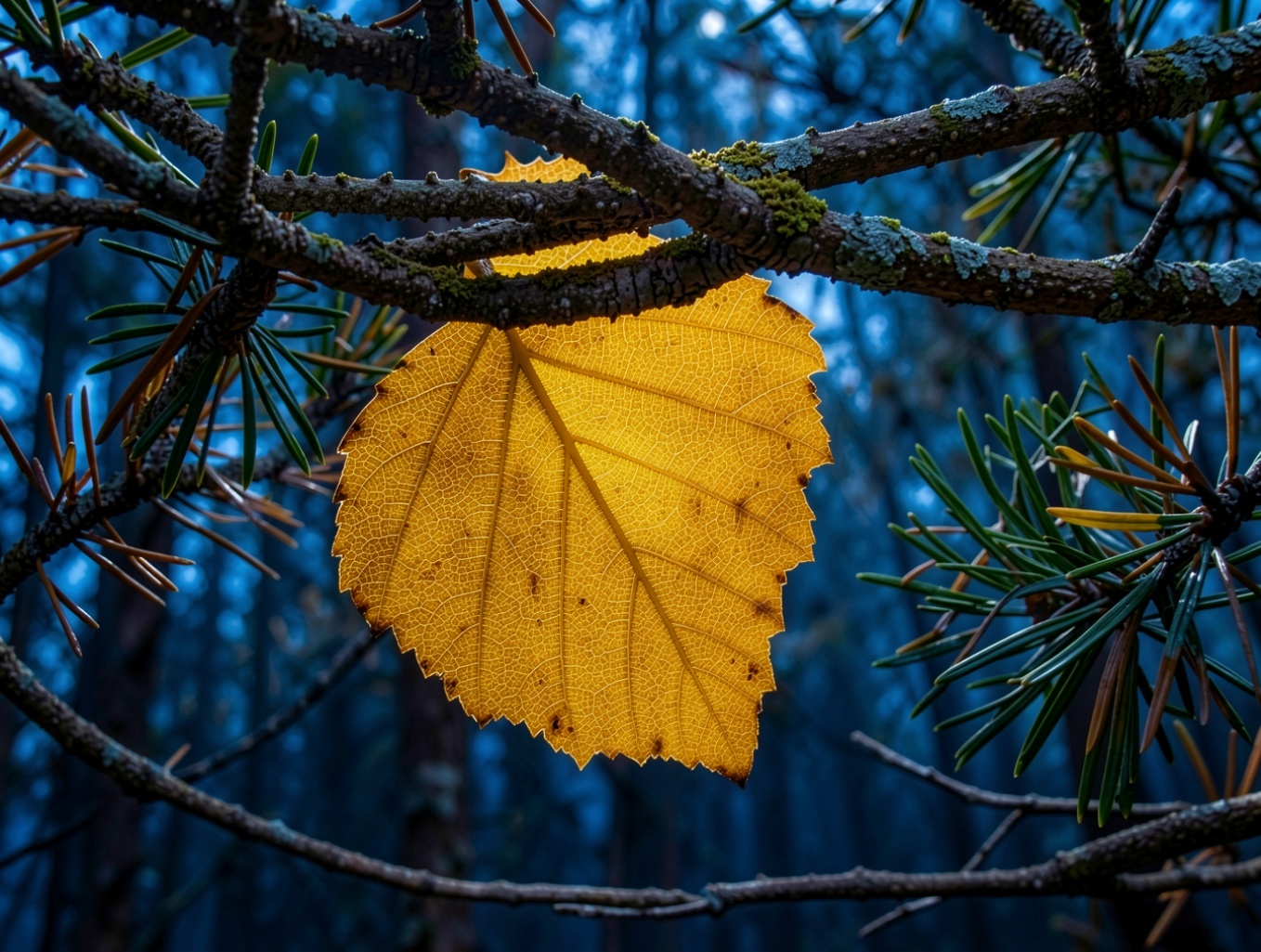 Желтый осенний лист на темных ветвях леса