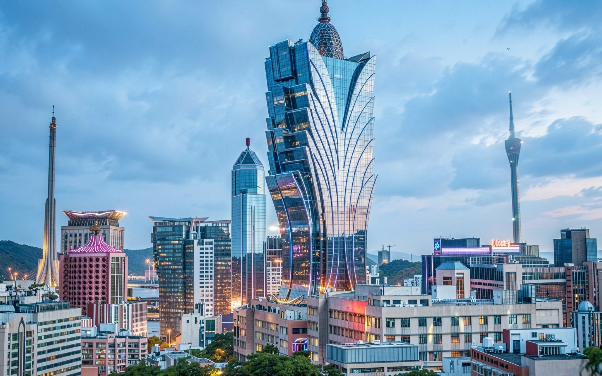 Небоскреб Grand Lisboa в вечернем Макао