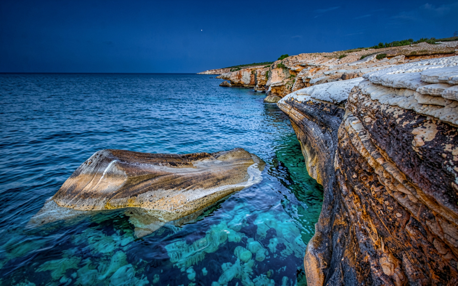 Скалистый берег моря синий вечерний свет