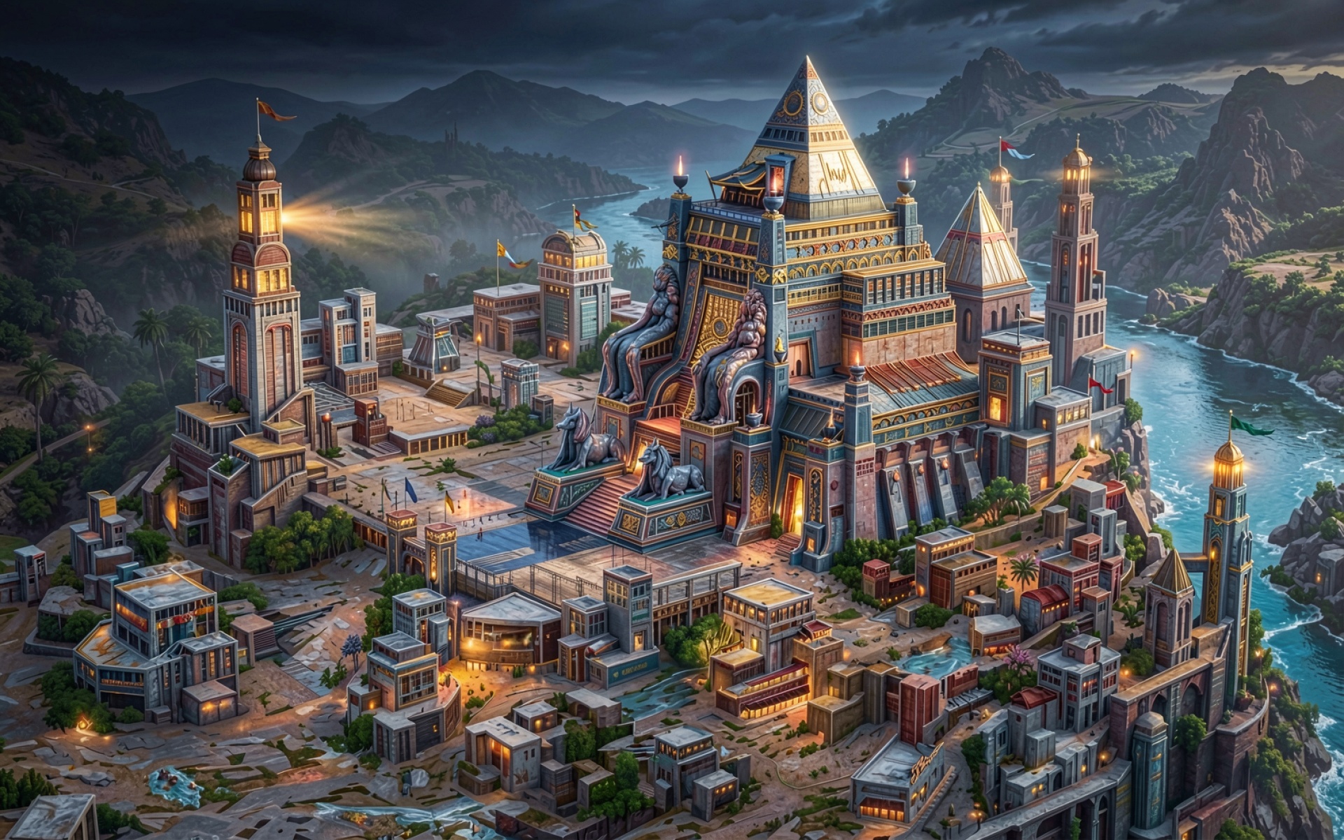 Древний золотой город в вечерних горах