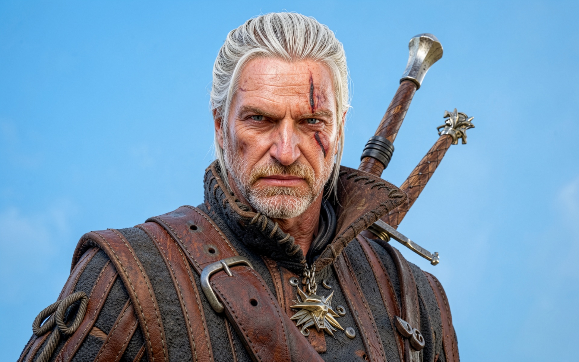 Геральт из Ривии суровый взгляд голубой фон