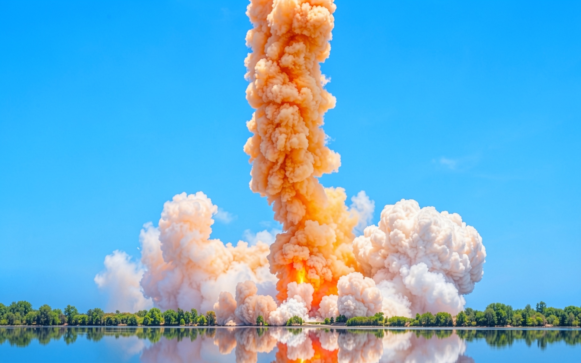 Огненный гриб взрыва на фоне синего неба