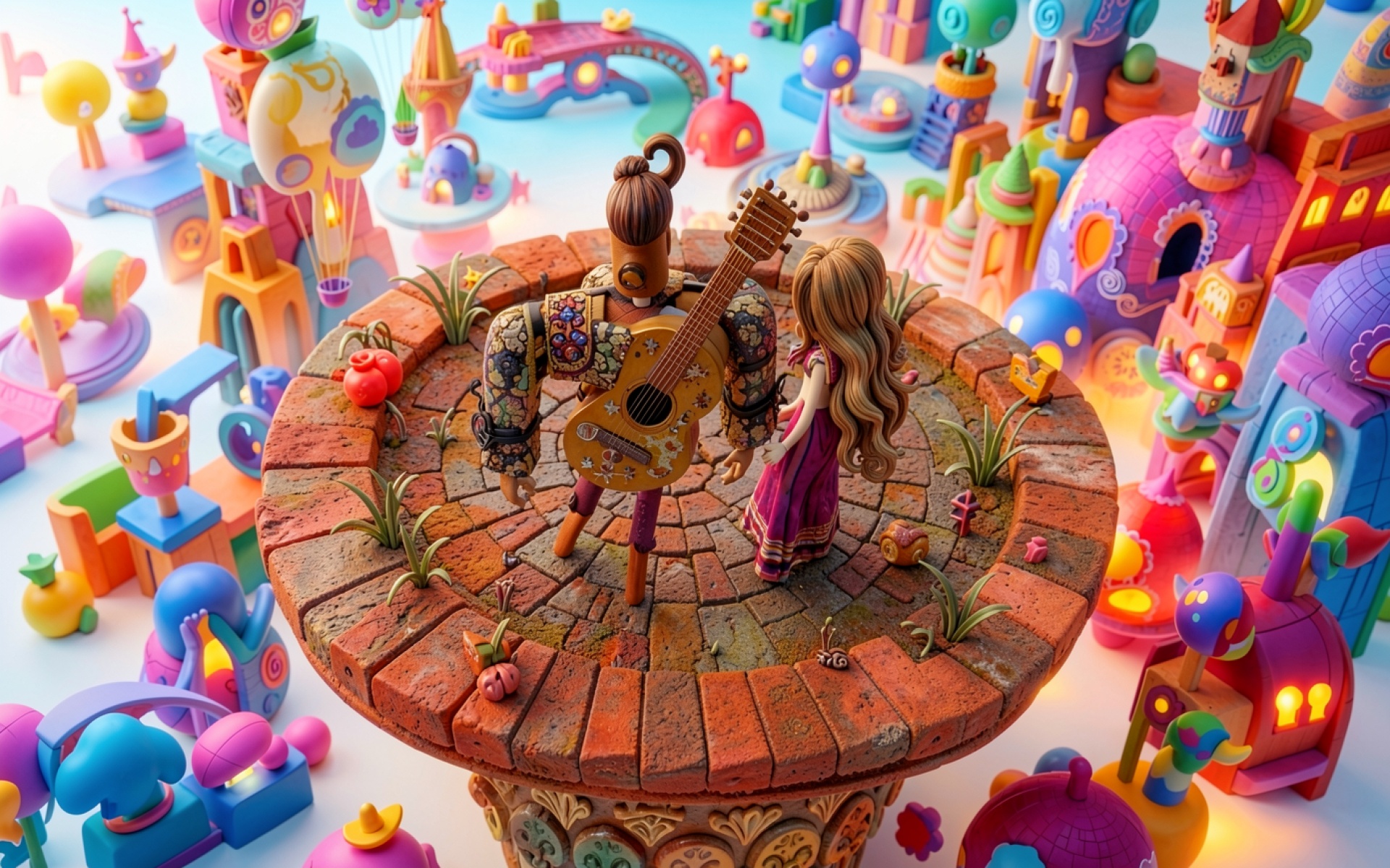 Пара влюбленных с гитарой в сказочном городе